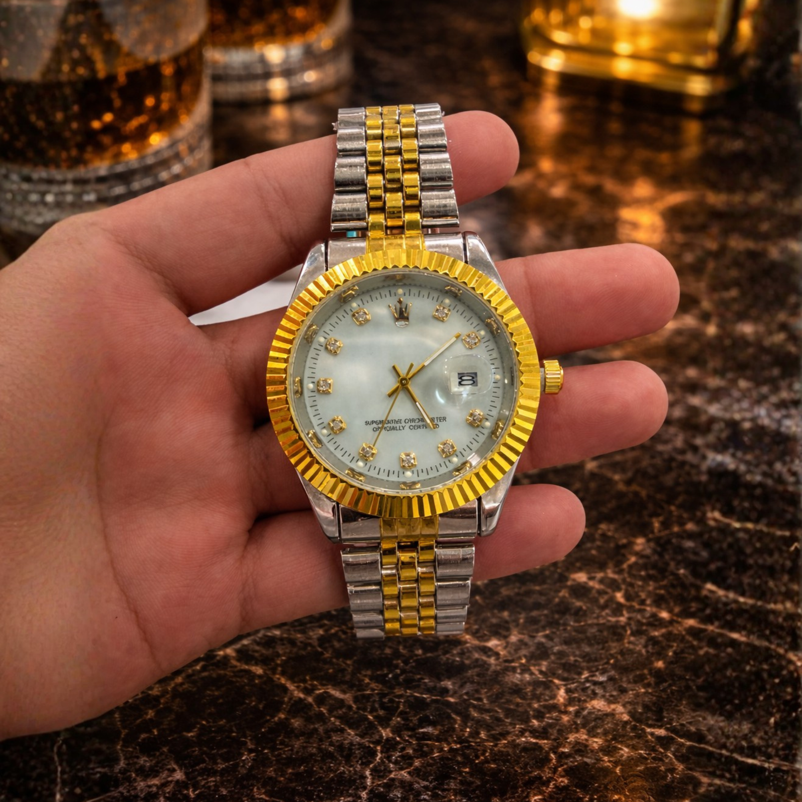 Un reloj masculino elegante con diseño bicolor que combina acero plateado con detalles dorados. Su bisel acanalado y sus indicadores tipo cristal crean un estilo clásico y sofisticado ideal para un look distinguido.