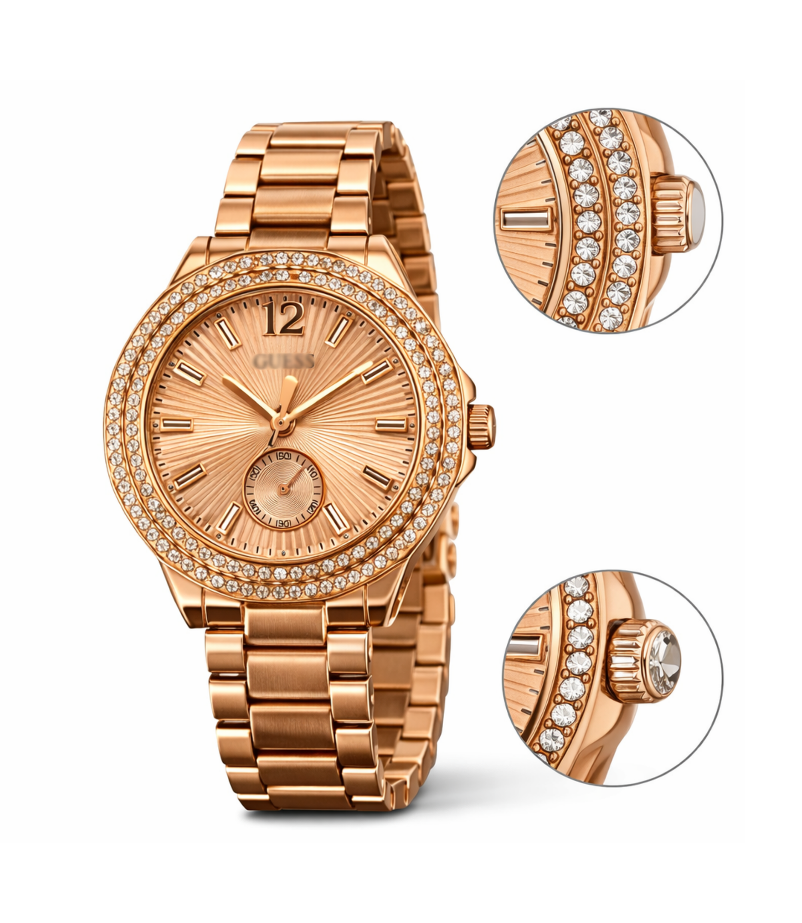 Un reloj femenino que combina elegancia y brillo en cada detalle. Su acabado rose gold y el bisel con cristales lo convierten en el complemento perfecto para elevar cualquier look, desde el día a día hasta ocasiones especiales.