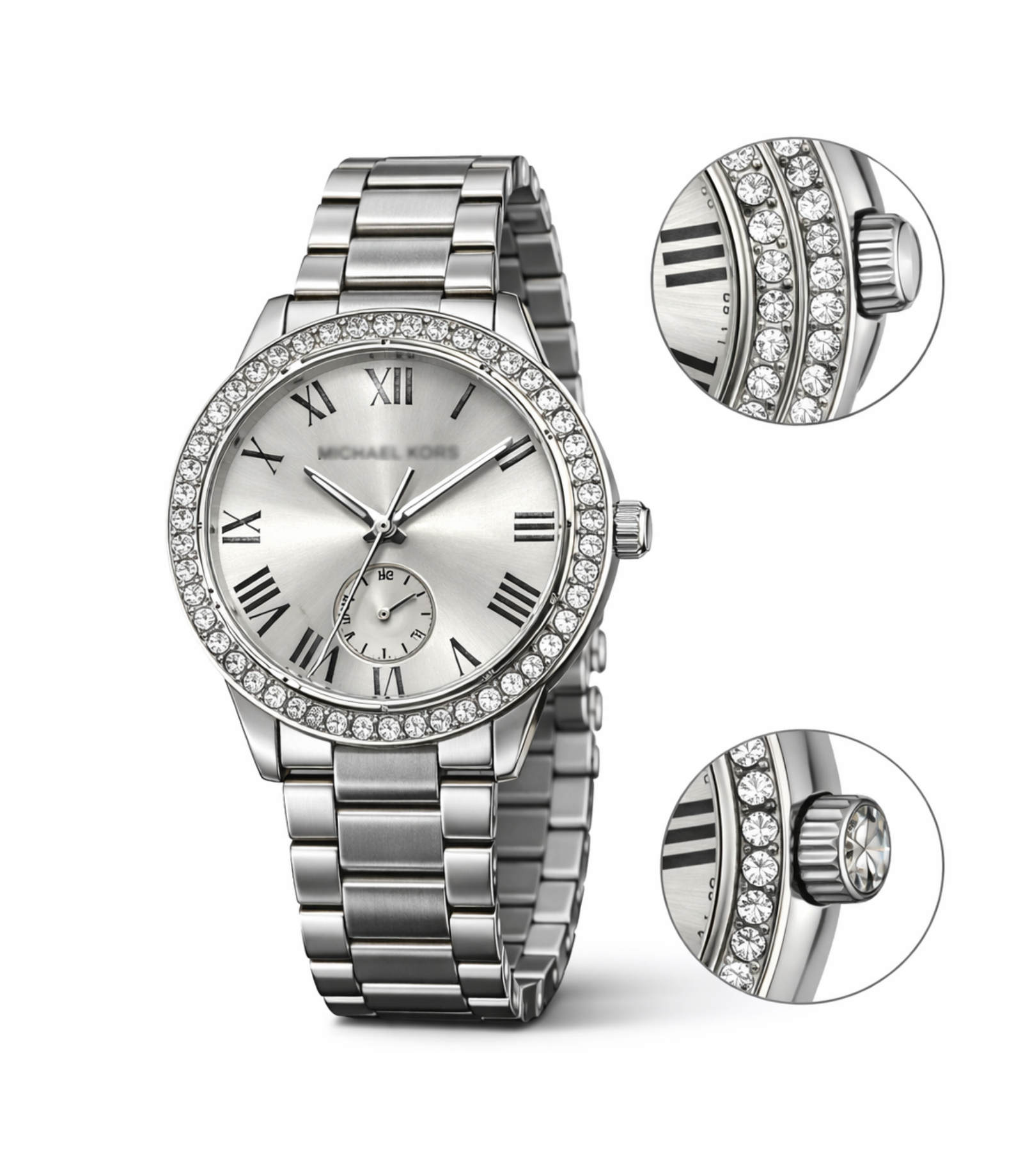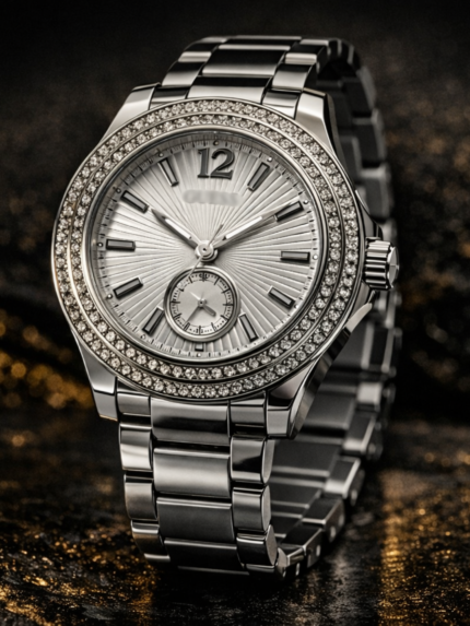 Un reloj elegante y sofisticado que destaca por su acabado plateado y su bisel con cristales brillantes. Su diseño clásico con números romanos aporta un estilo refinado que combina perfectamente con looks formales y casuales.